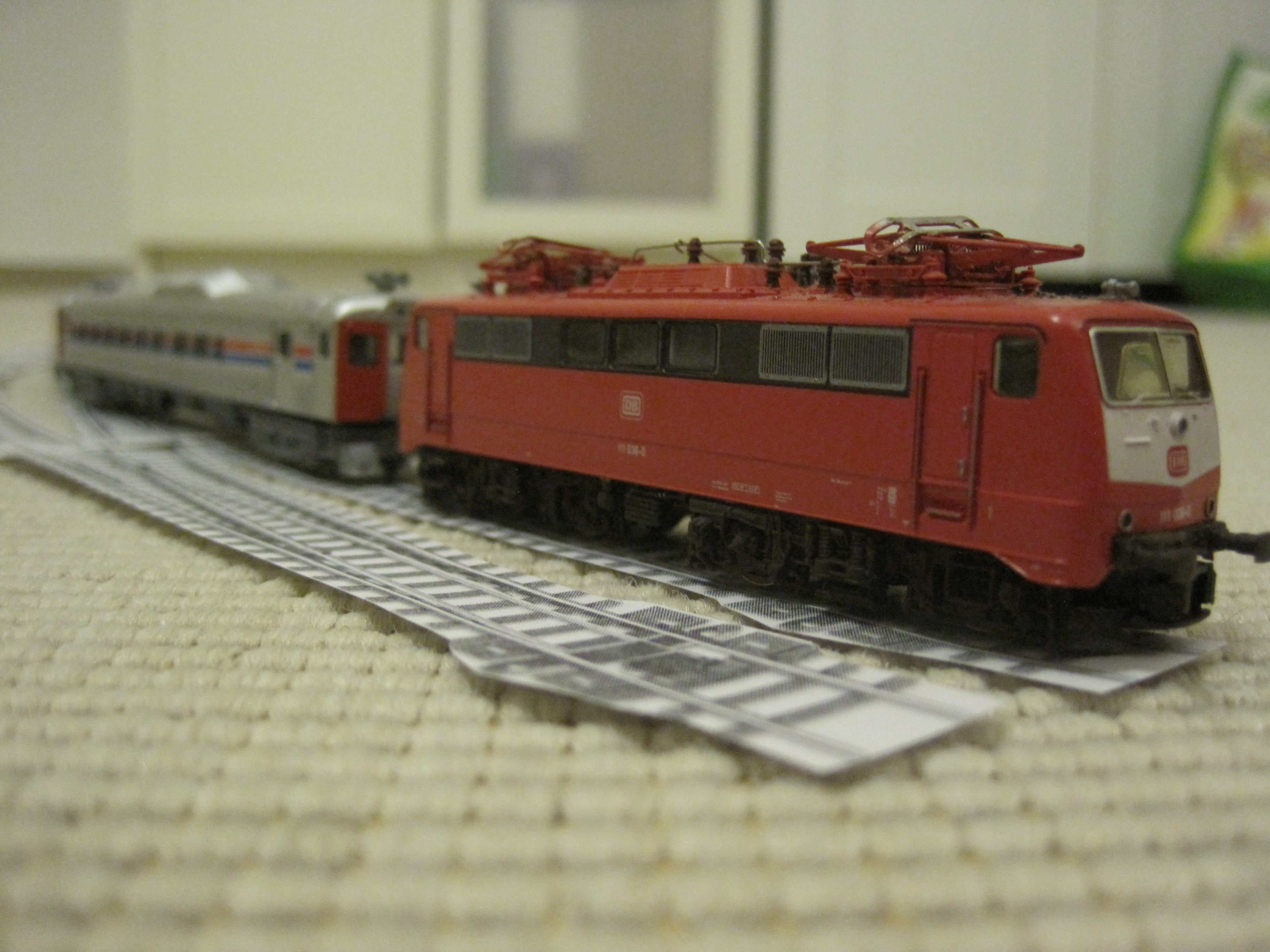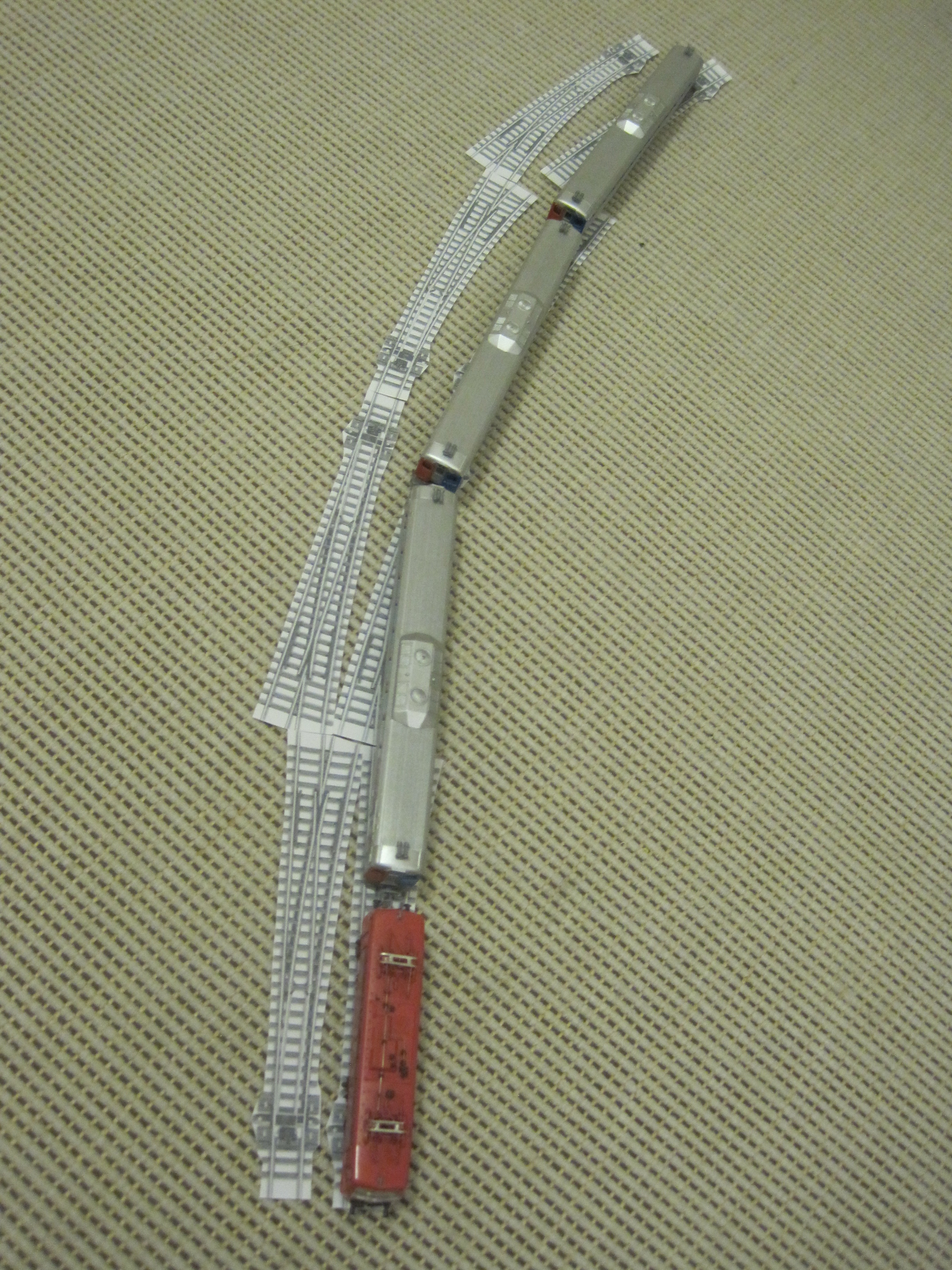 The Budd RDC cars and my DB BR111 serve as test train for this purpose, lending a 3D effect to an otherwise 2D rapid prototyping. There is minimal overhang as I use large left/right-hand radius and curved turnouts.