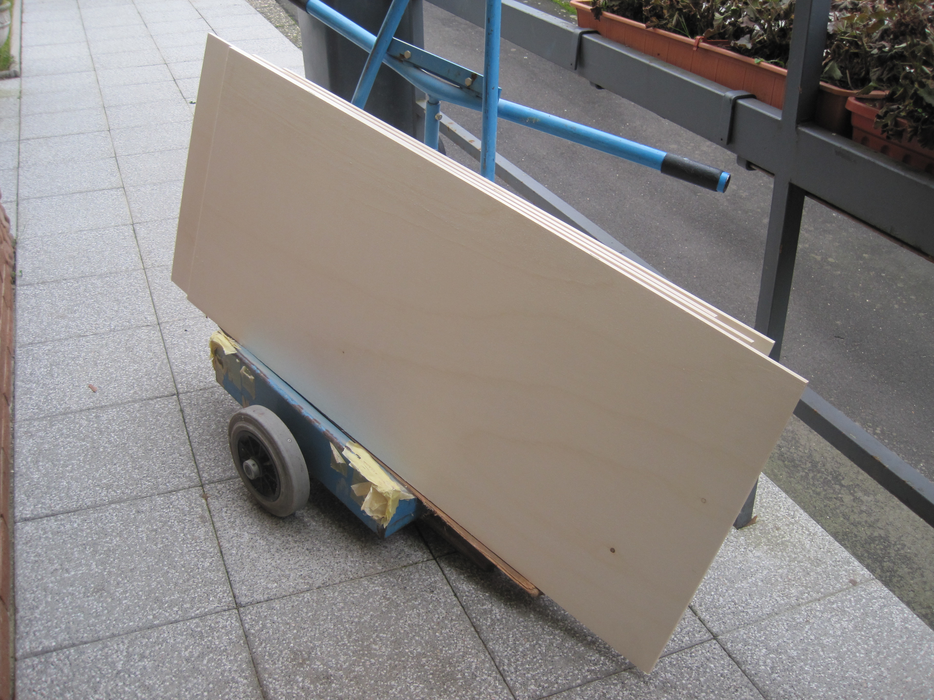 I got my first piece of 2.5m x 1.7m 10mm thick poplar plywood sheet from a nearby wood mart. They have cut into into 4 pieces for easy transport and provided a trolley for that. I had to walk 750m with this thing to and from my house. The sheets are sufficient for 2 large module (Modules A and E) and 2 equal sized smaller modules (Modules G and H). I will start with Modules A, E, G and H (see trackplan). Modules G and H are by the windows. I would probably need to get extra sheet at least for Module F too so that I could have a continuous Modules E, F, G , H and A, which occupy the north part of the balcony. My idea is to stabilise and level the height of the modules before actually adding the track subroadbeds.