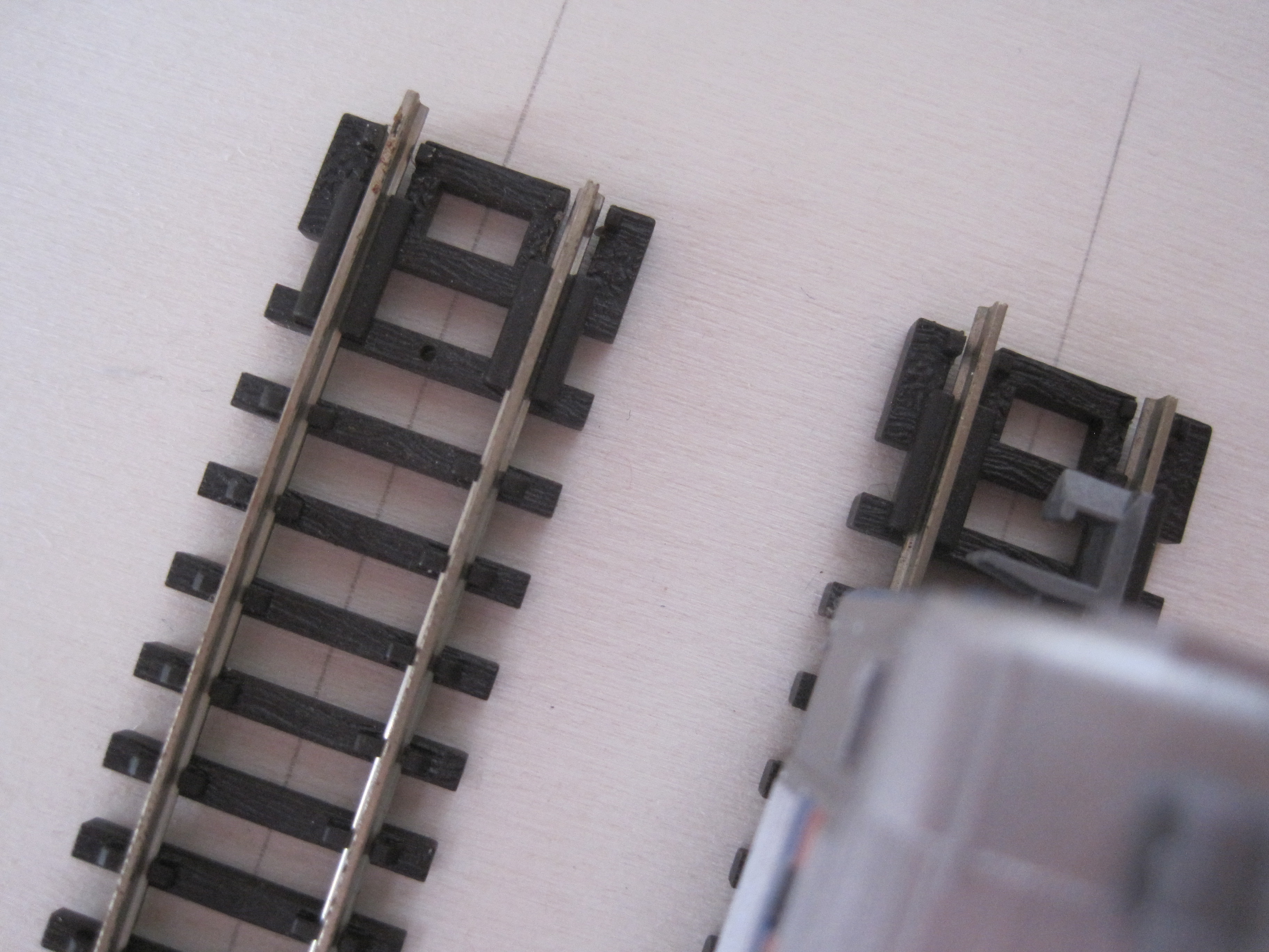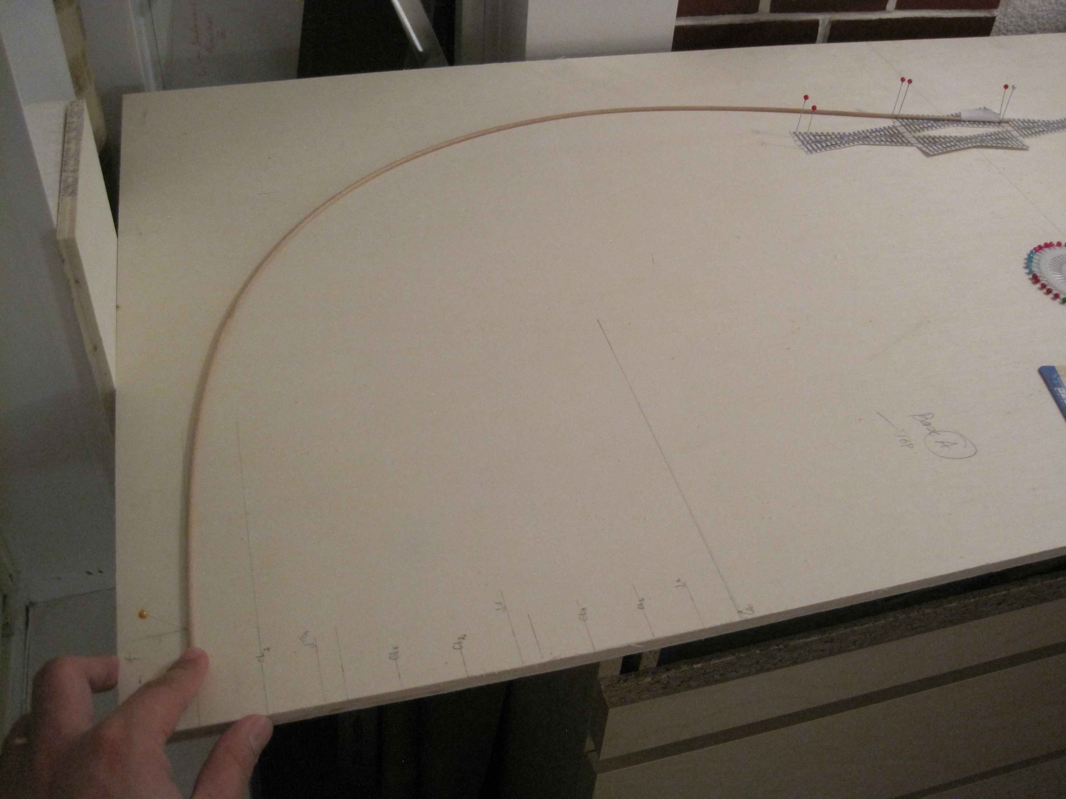 I found this easement/transition stick useful especially when you do not have space to make a wide radius line. The pivot point of this curve would be outside the base. In addition, I would not be able to get a smooth curve with other method(s). All you need to do is draw the centre-line (CL) at each ends, pin one end of the stick and make sure you have at least 1-1.5 inch of straight track before the curve part begins or ends. Then you trace along the curve slowly and without exerting pressure on the stick. And, because the stick is very flexible, you can adjust or bend it up to its breaking point. So far, it survived in its original 1meter long piece. I have not completed the rest of the markings but will do so once I get all the Segment E to H up. Then, I would be able to ensure that all tracks and curves from one end to another have smooth transitions.