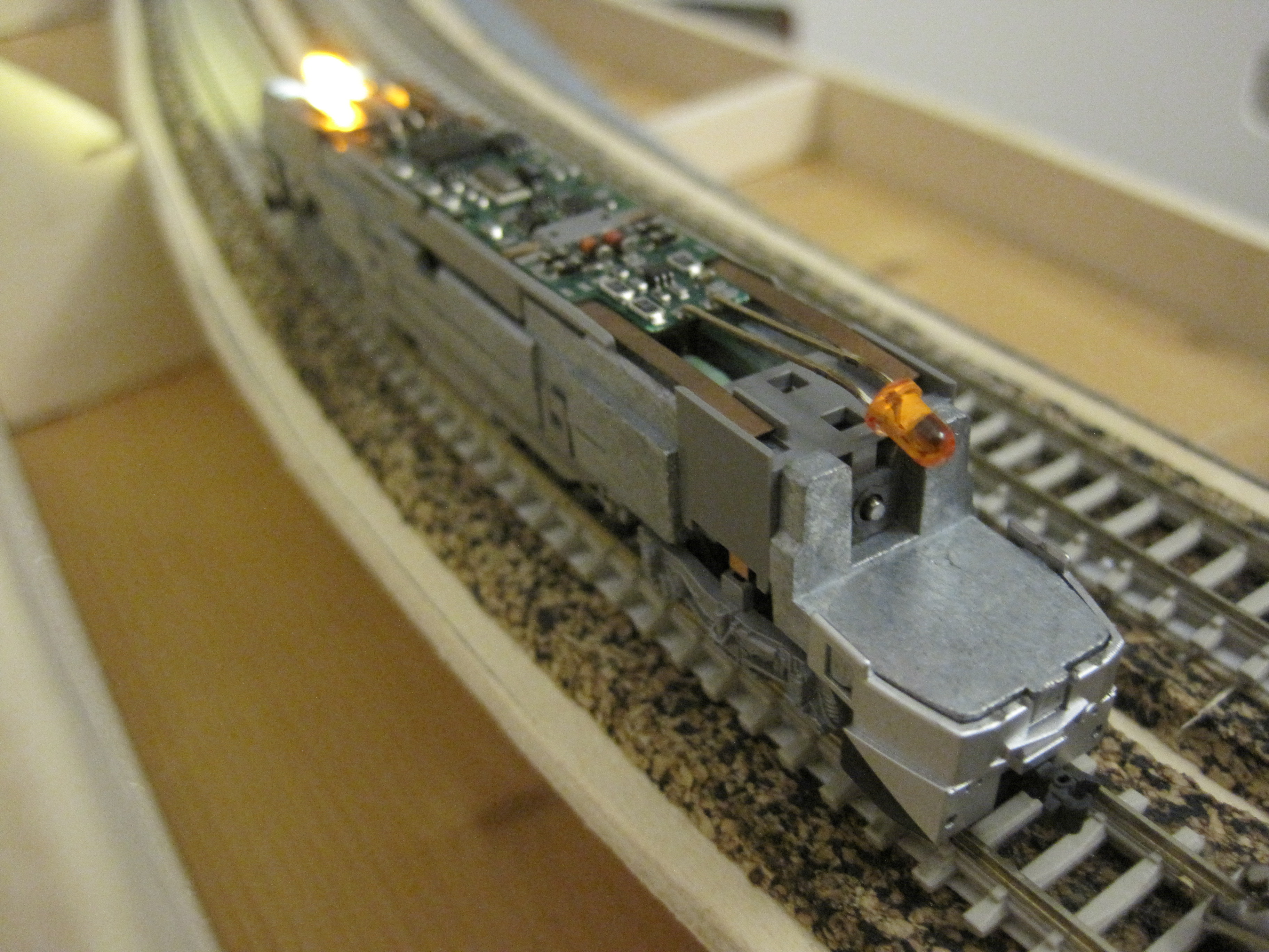 The initial run was not working. I removed the shell and discovered that the motor and the running gears were disconnected. I guessed it must have jerked during the shipment to Germany. A short twitch put the gears in order and the lights were on again. It was a good sign. When the light is on, means the decoder works. I let it run a few times before putting the shell back.