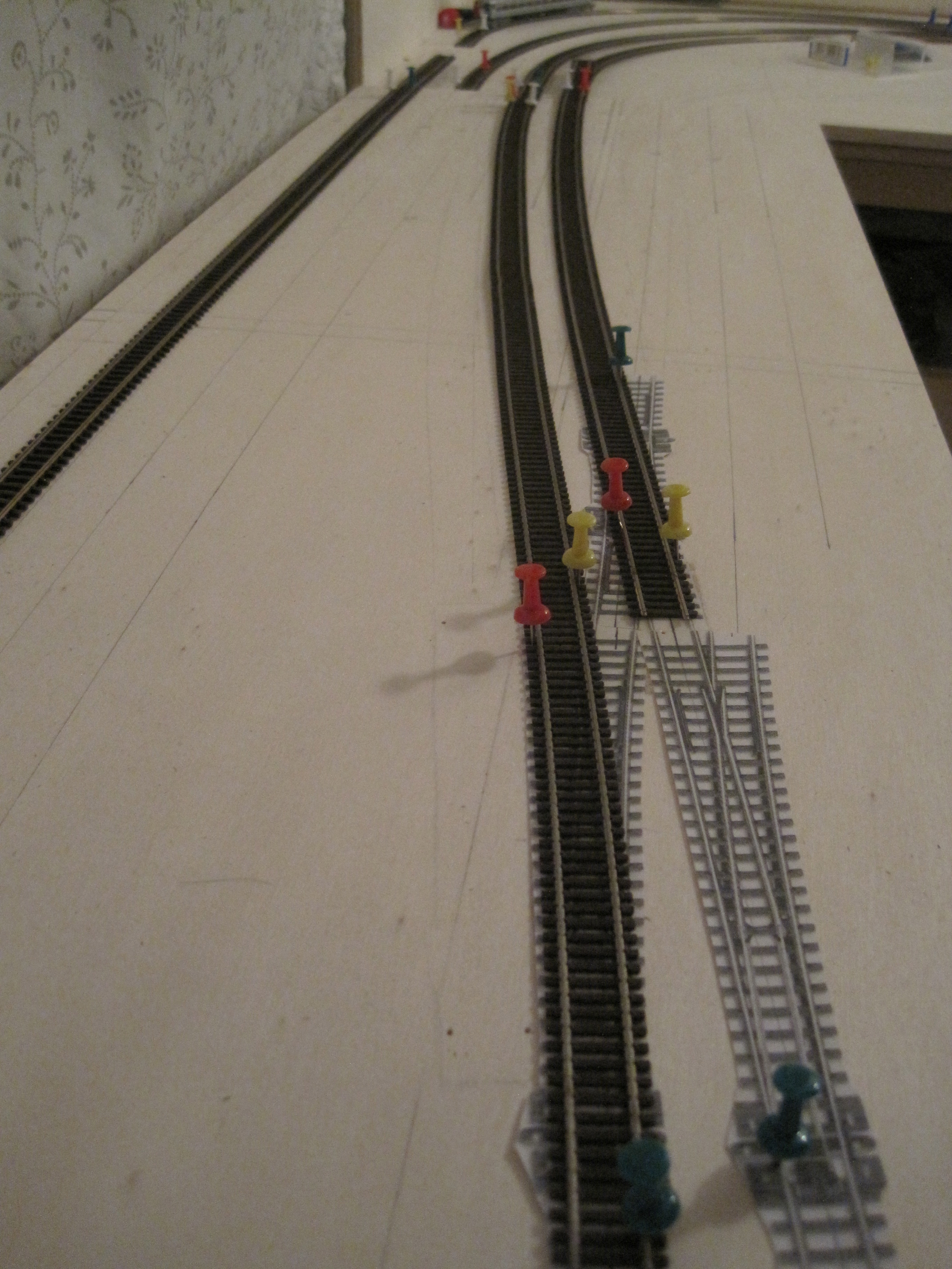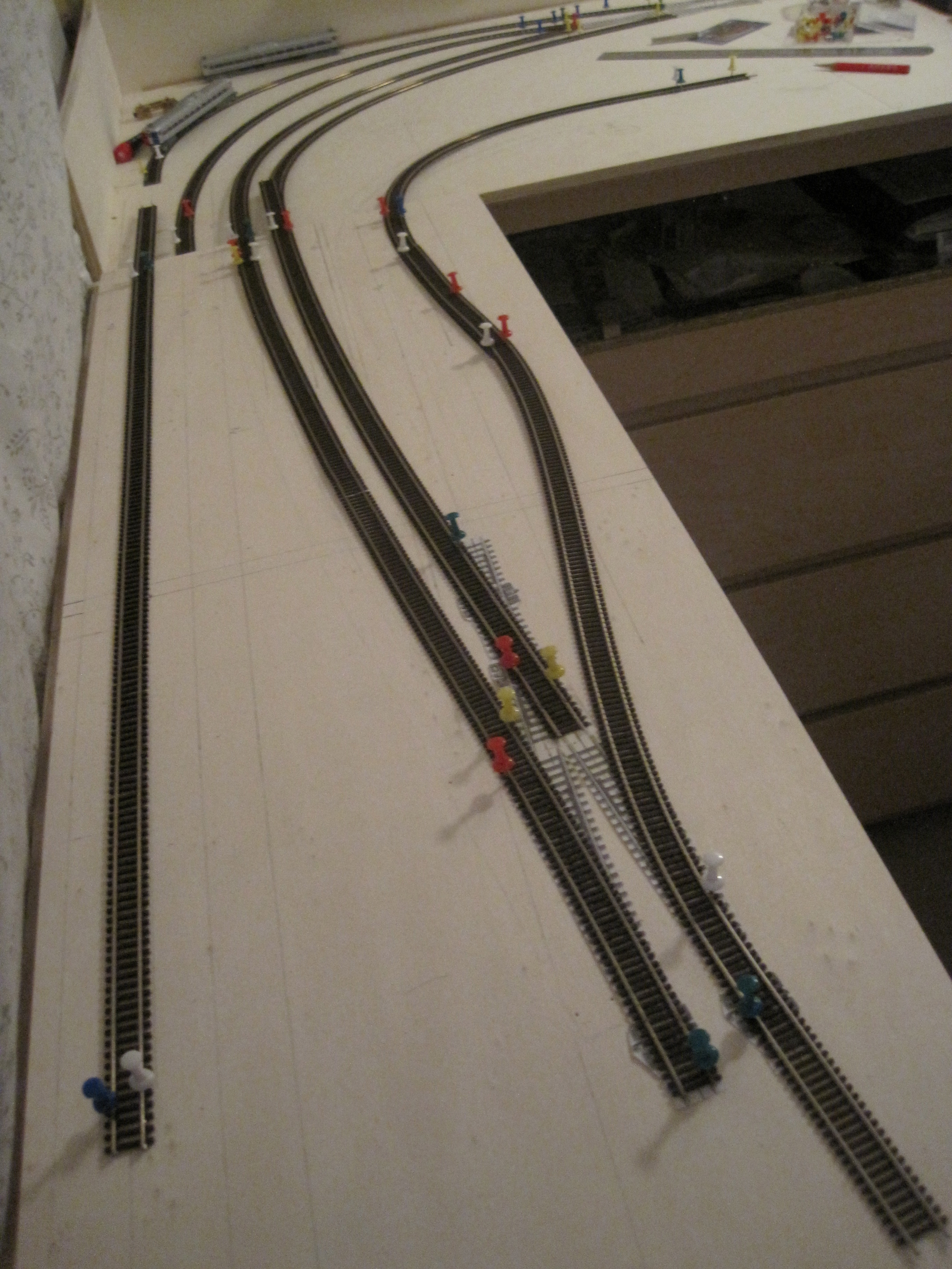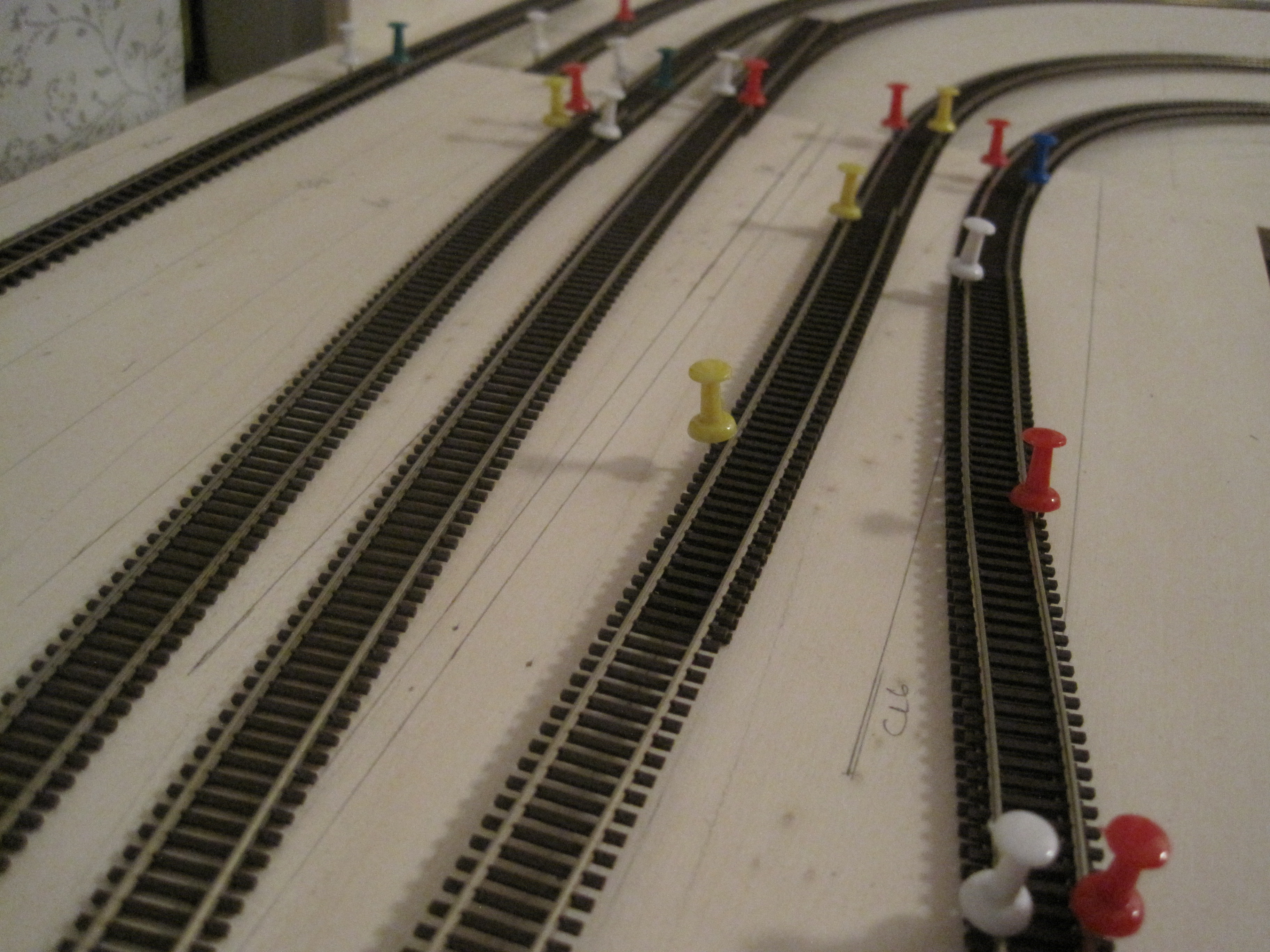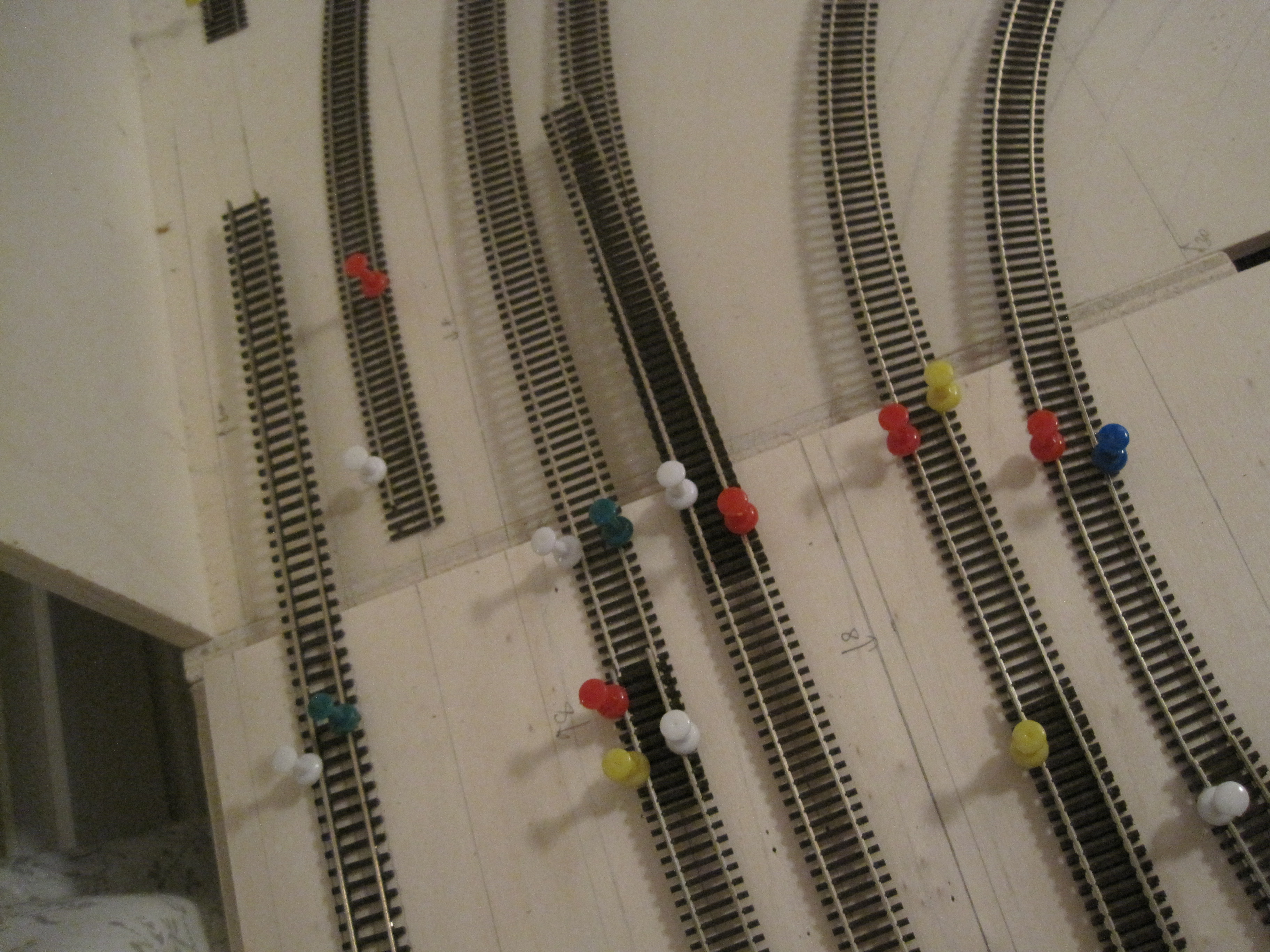 A simple technique that would save you a lot of headaches in laying tracks especially when you have lots of tracks that criss-cross each other and where you want to make sure you have adequate spacing between tracks for obstructions and trackside structures.