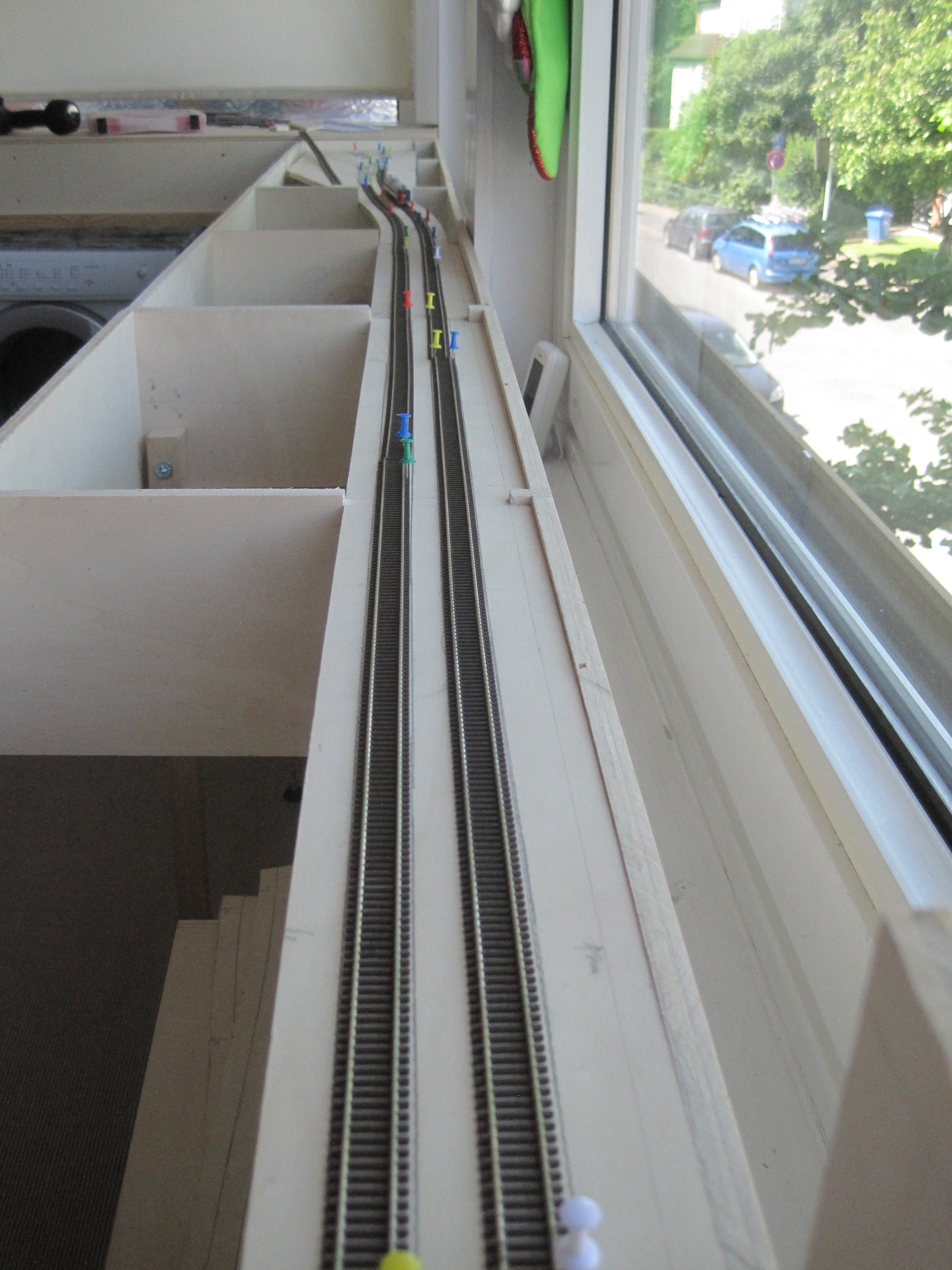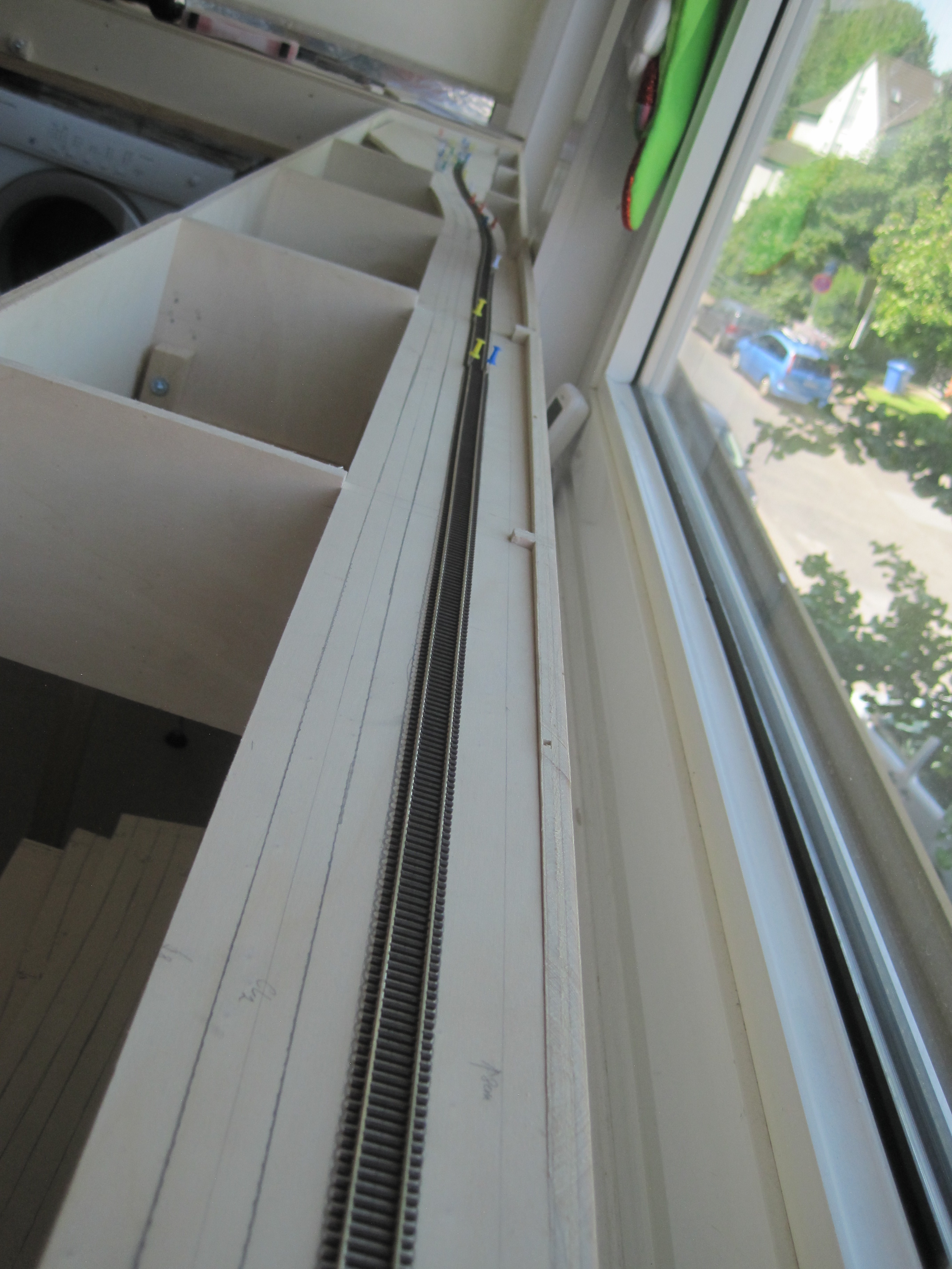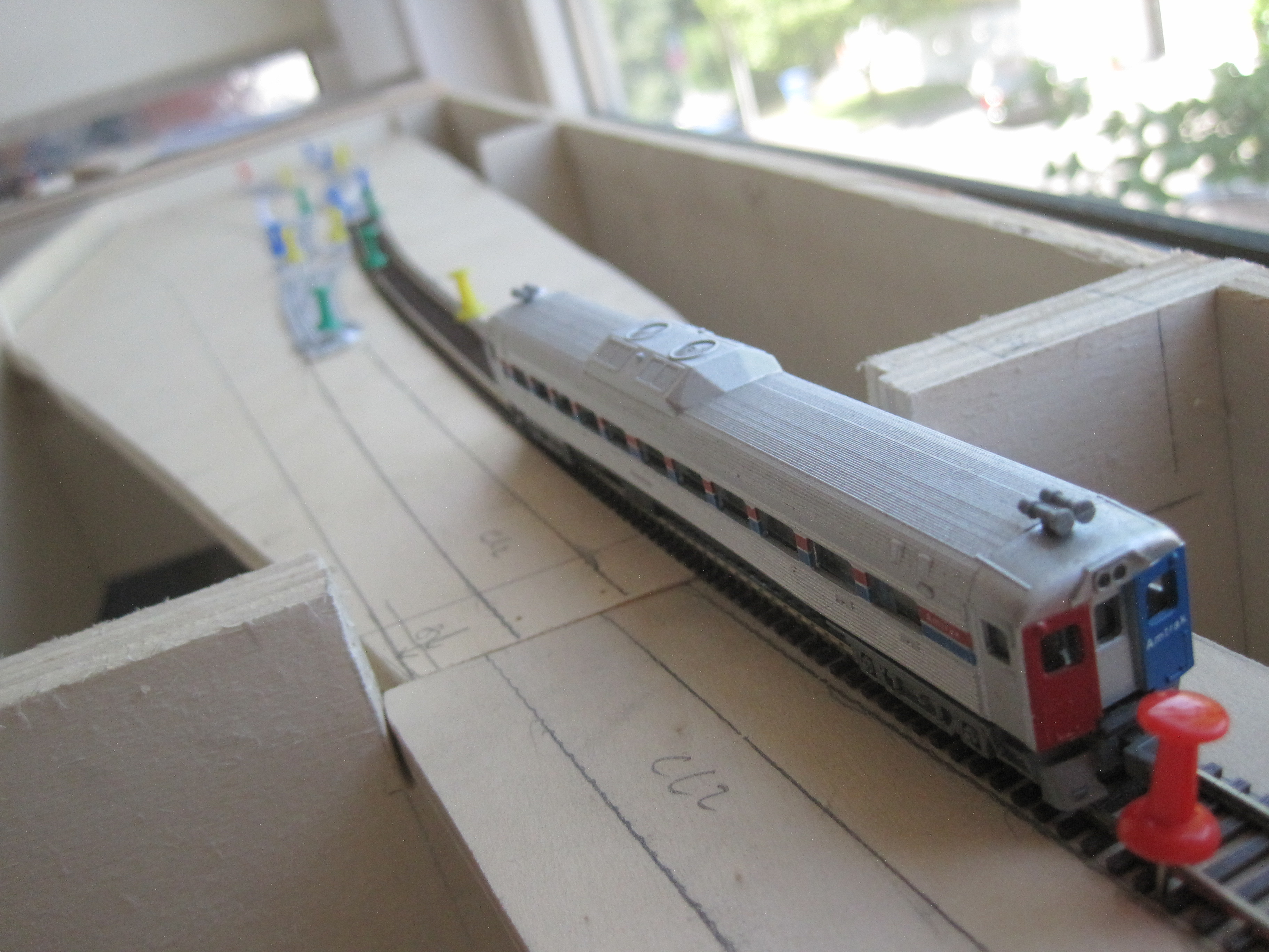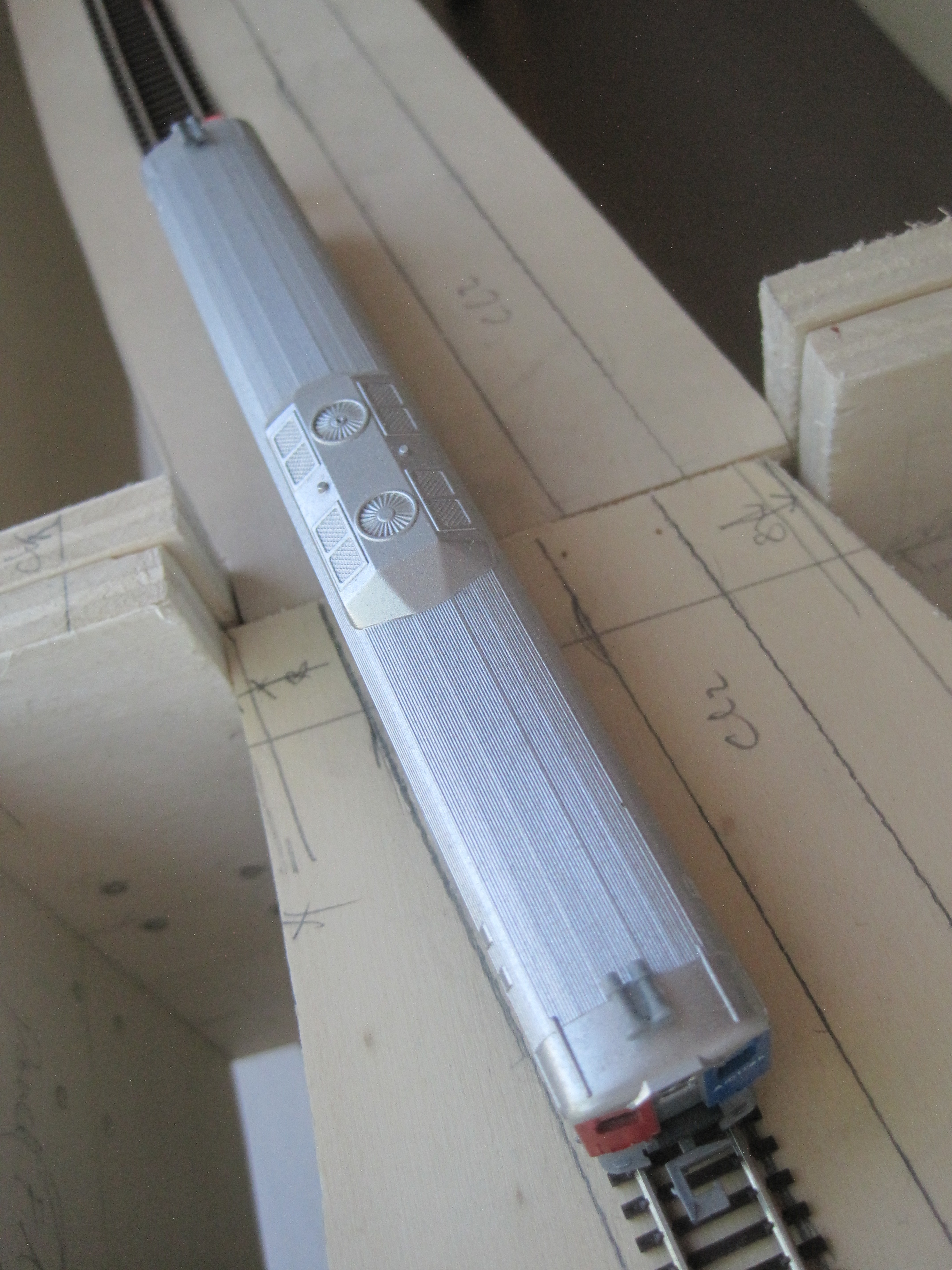 As always, my faithful RDC was doing its job of clearance test. I left 8cm between each track centre and the edge of the sub roadbed, so that there would always be enough clearance for trackside objects or should there be a derailment, the train would not make an immediate dive to the floor. At a later stage, I would add low skirting made out of styrene or cardboard to protect the edges. Extra insurance is always welcomed.