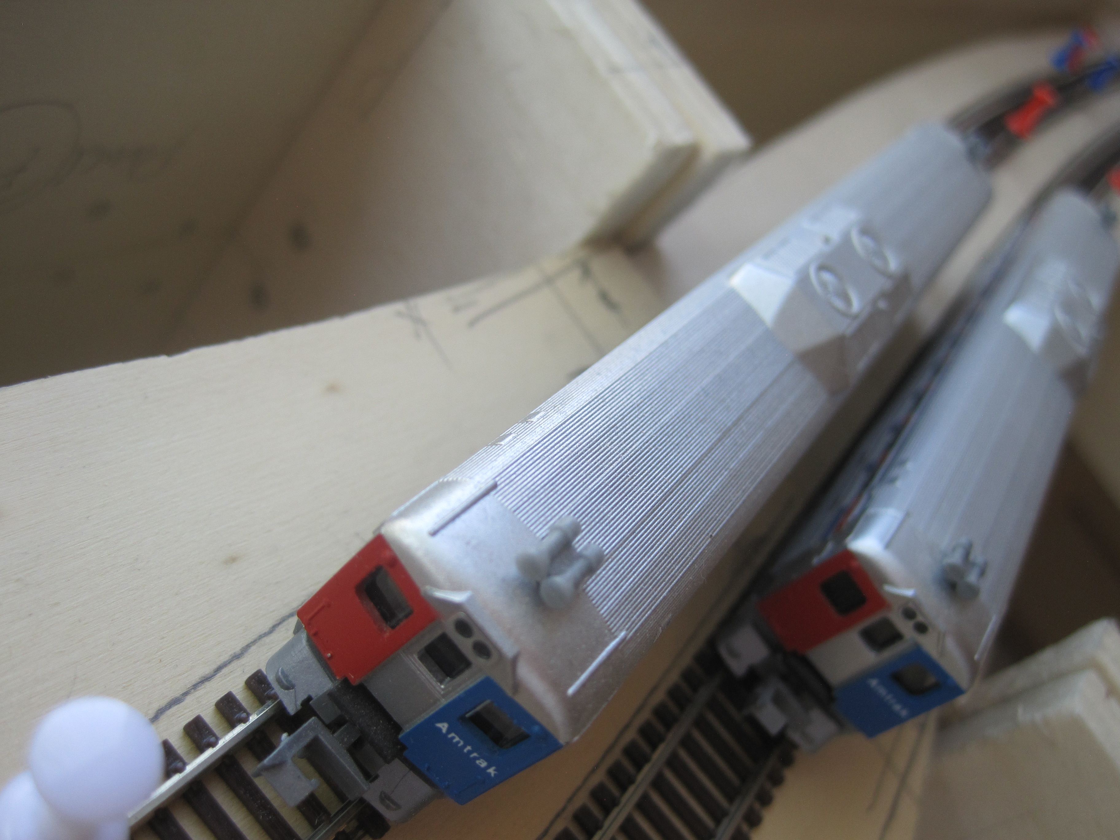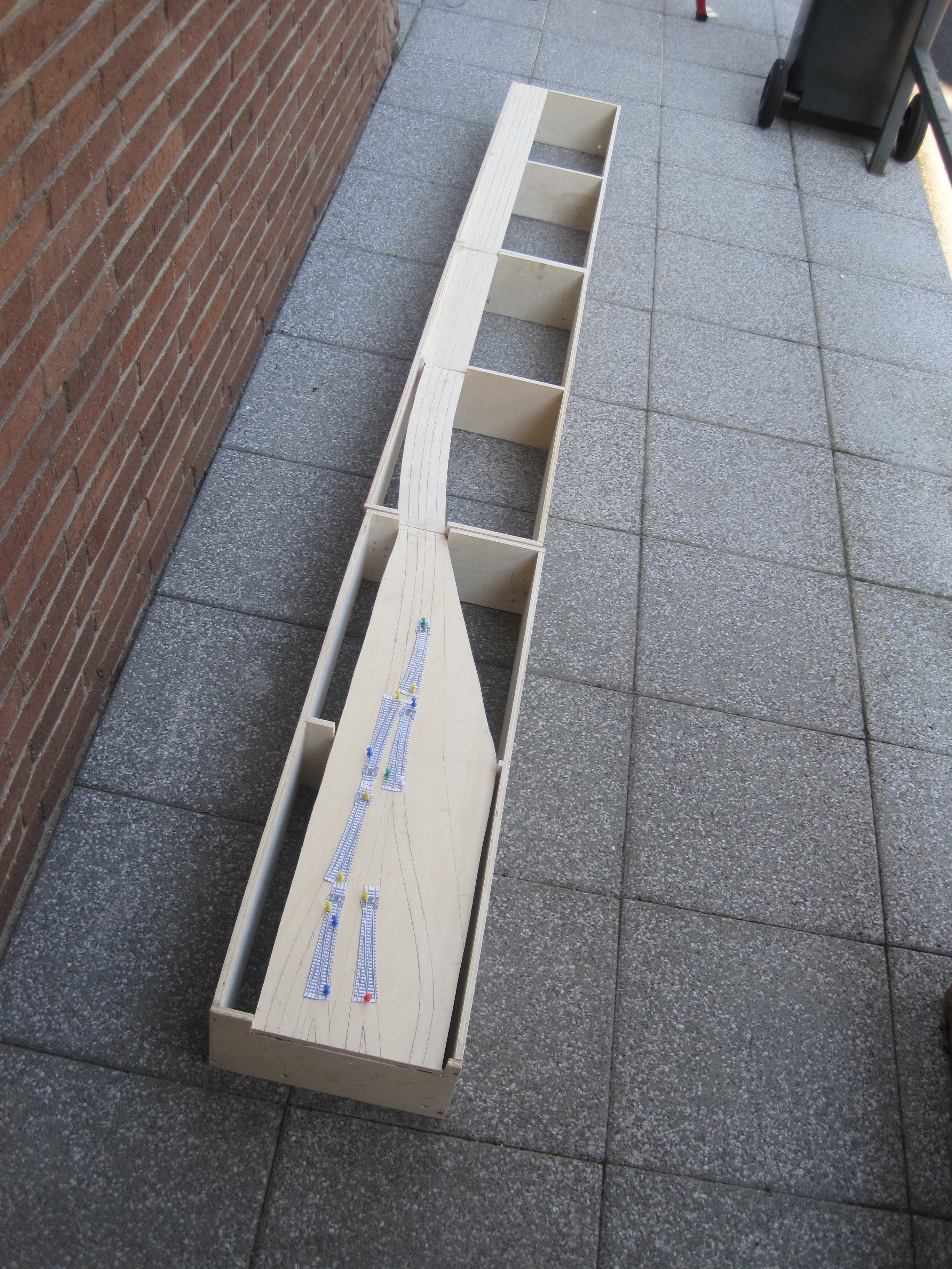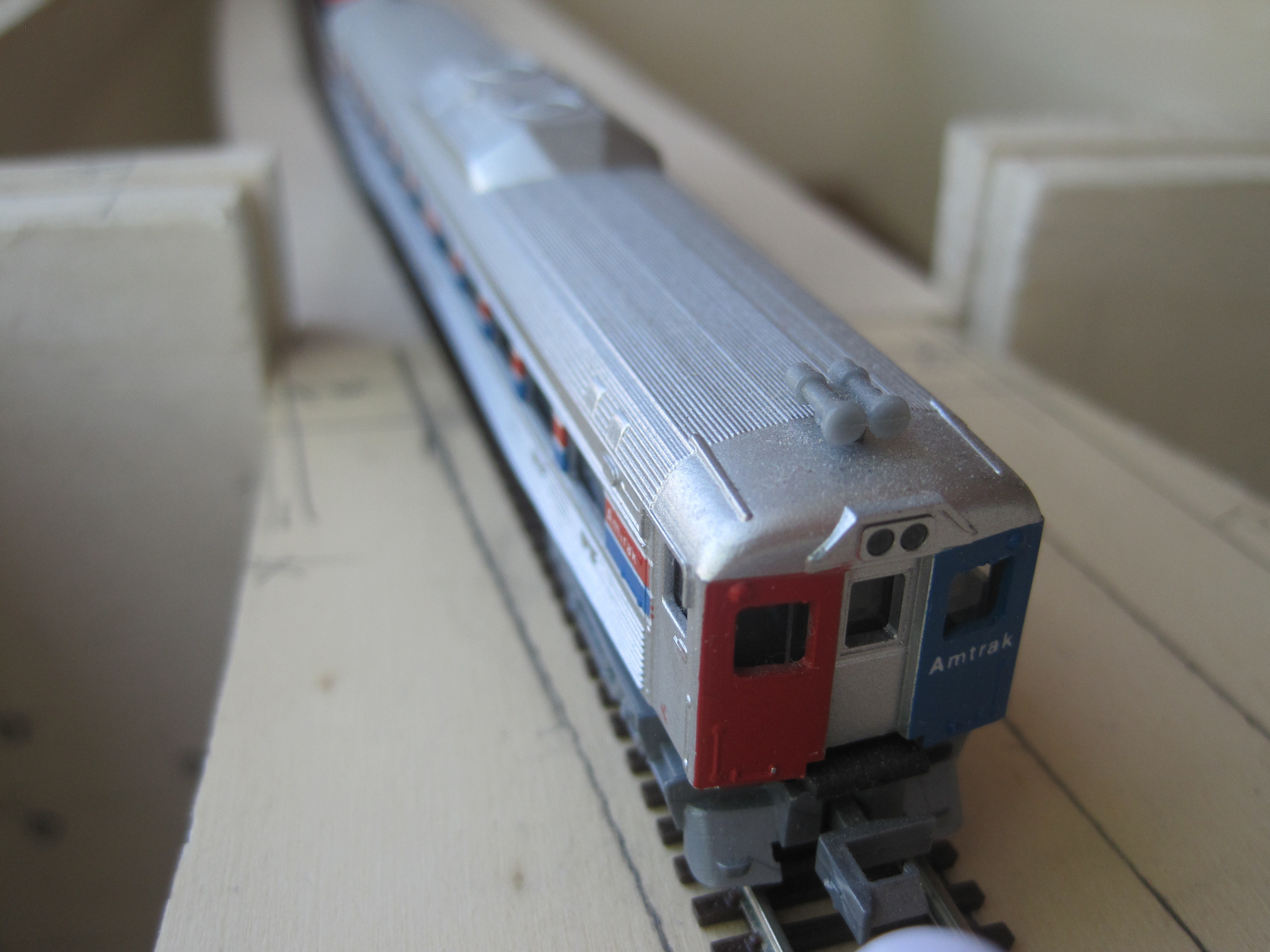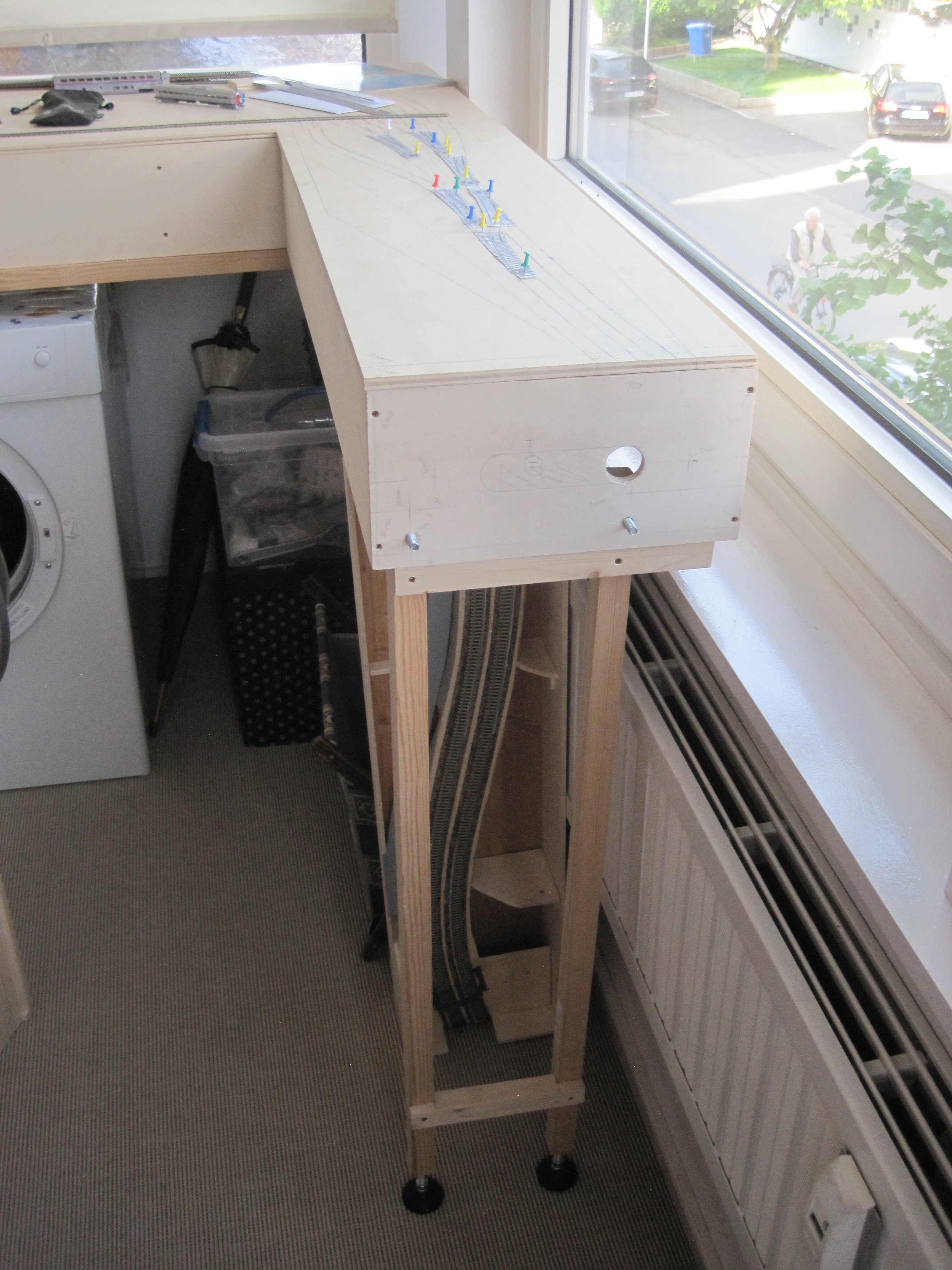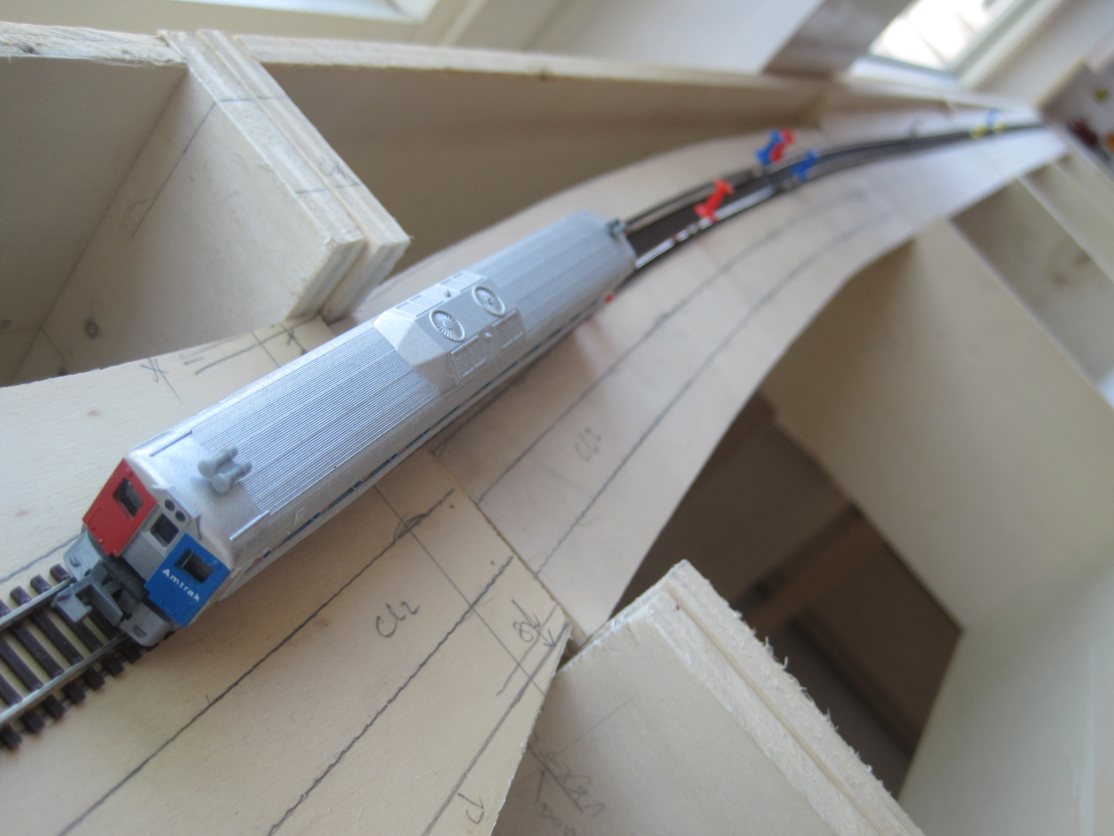 As always, my faithful RDC was doing its job of clearance test. I left 8cm between each track centre and the edge of the sub roadbed, so that there would always be enough clearance for trackside objects or should there be a derailment, the train would not make an immediate dive to the floor. At a later stage, I would add low skirting made out of styrene or cardboard to protect the edges. Extra insurance is always welcomed.