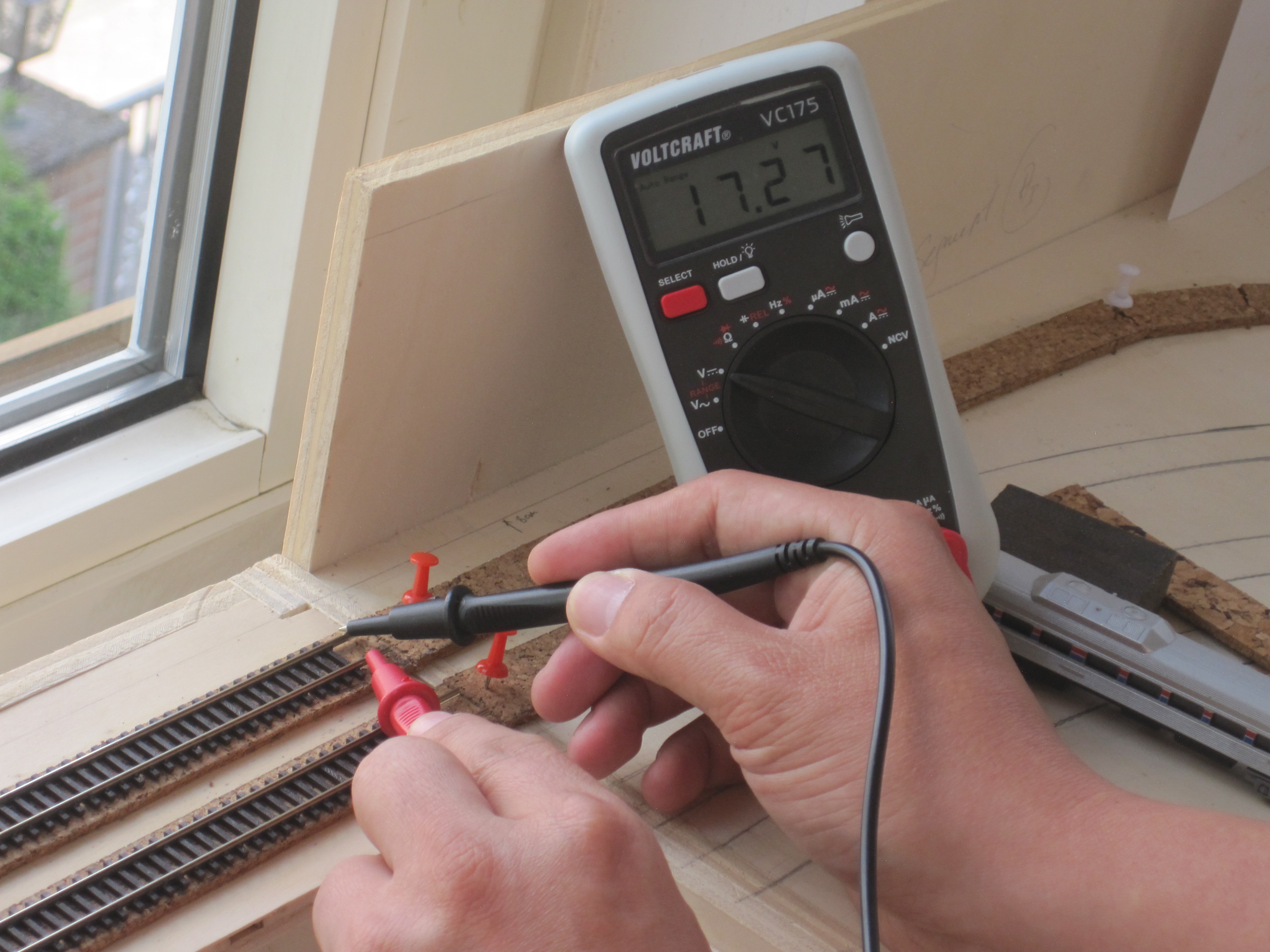 The first stretch 1.8m (or 3km in real-life) (each track) is ready although not ballasted. While waiting for the World Cup games to start, I spent some time cleaning the excess glues of the tracks and tested the pickup connection. At full throttle, it registered 17V (I am using Fleischmann analog DC transformer for tests)