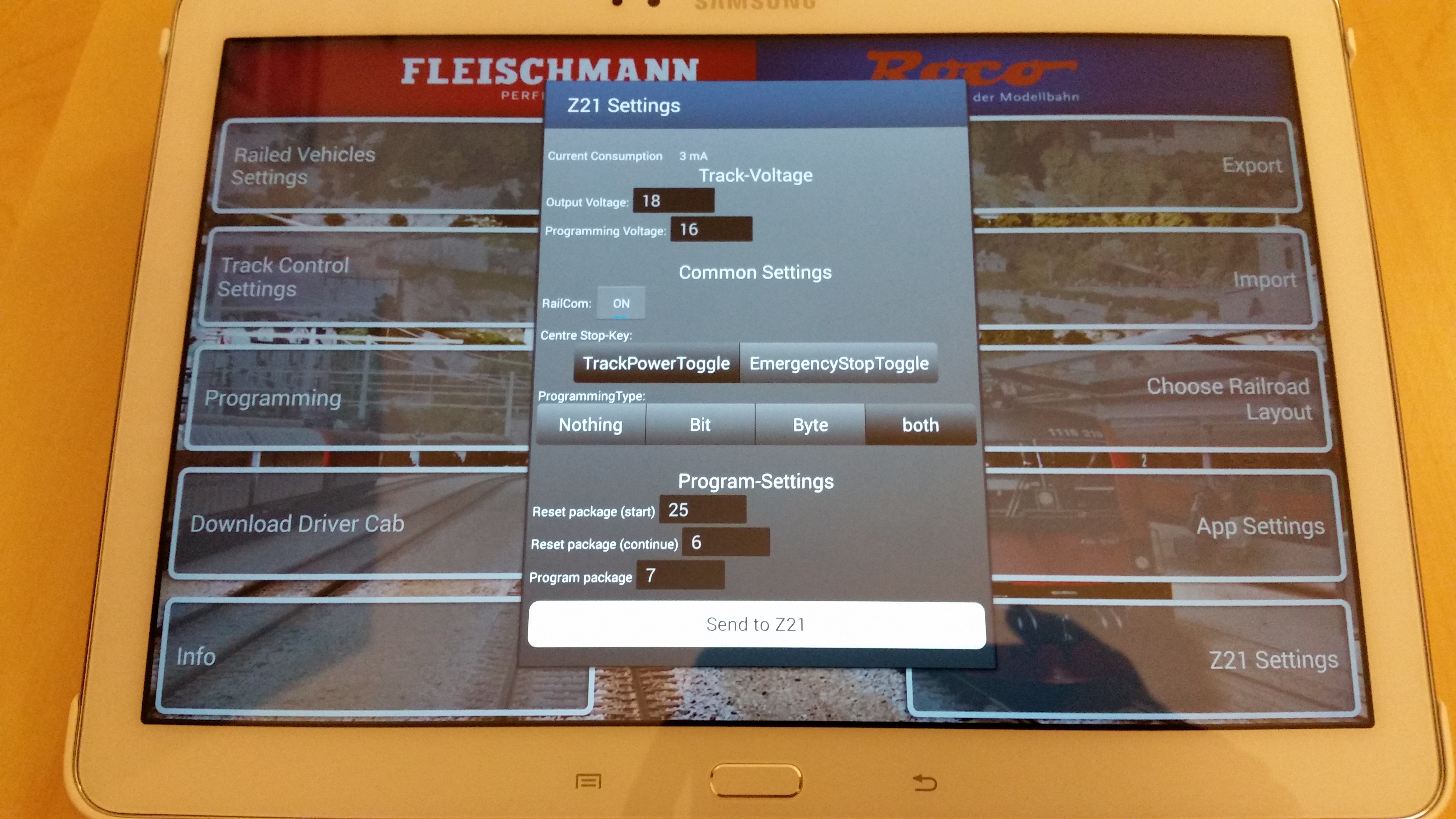Start the Z21 app and at main screen go to “Z21 Settings”. This is an important step before you put a DCC-loco on the track. This step is not explained in the online PDF manual. Notice the Track-Voltage reads Output Voltage “18” and Programming Voltage “16”. This output voltage applies to HO-scale. For N-scale, you need to change the output voltage to “12”. Failure to change this value would fry your N-scale decoder! The Programming Voltage should always be 2V below the Output Voltage.