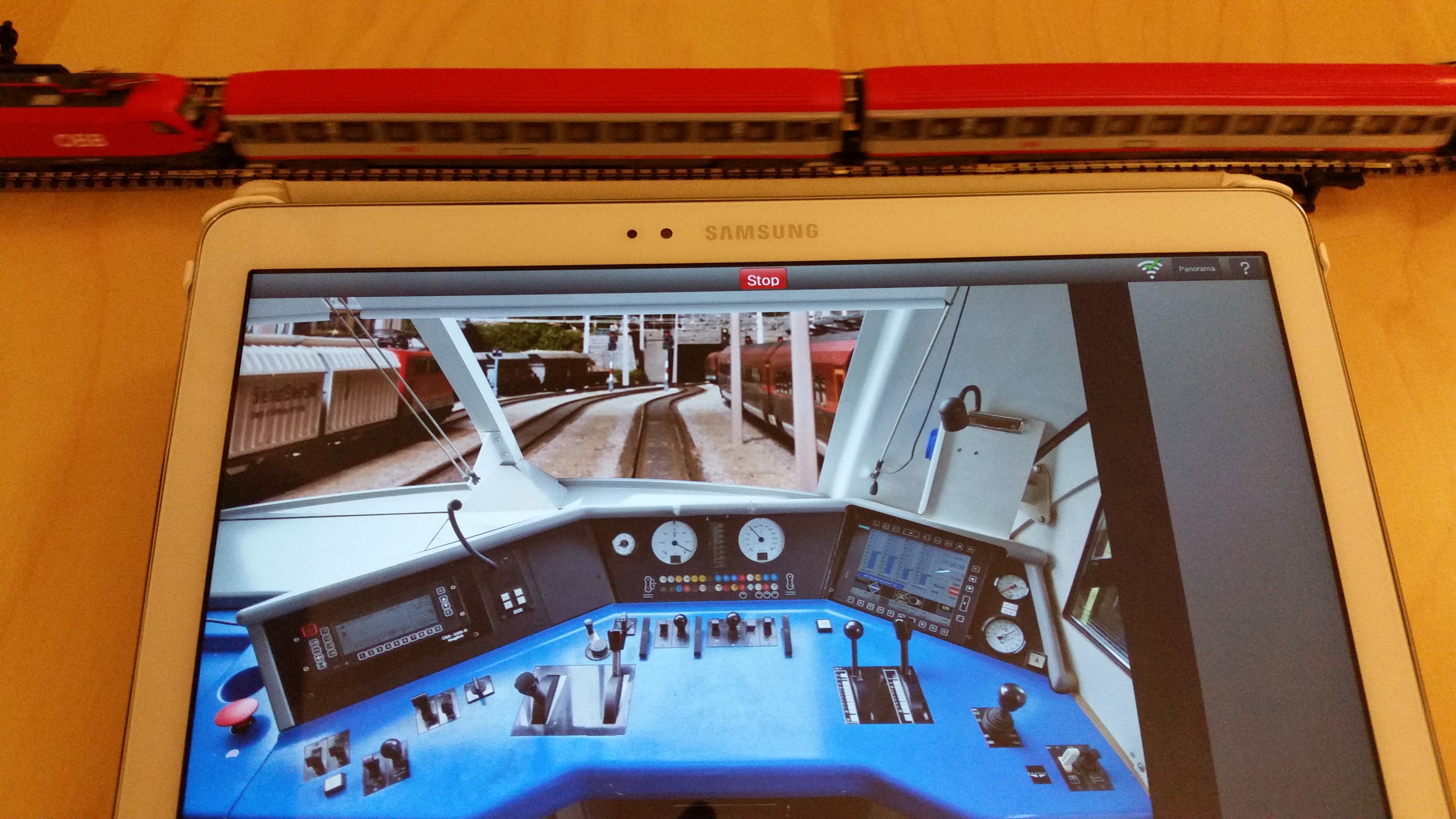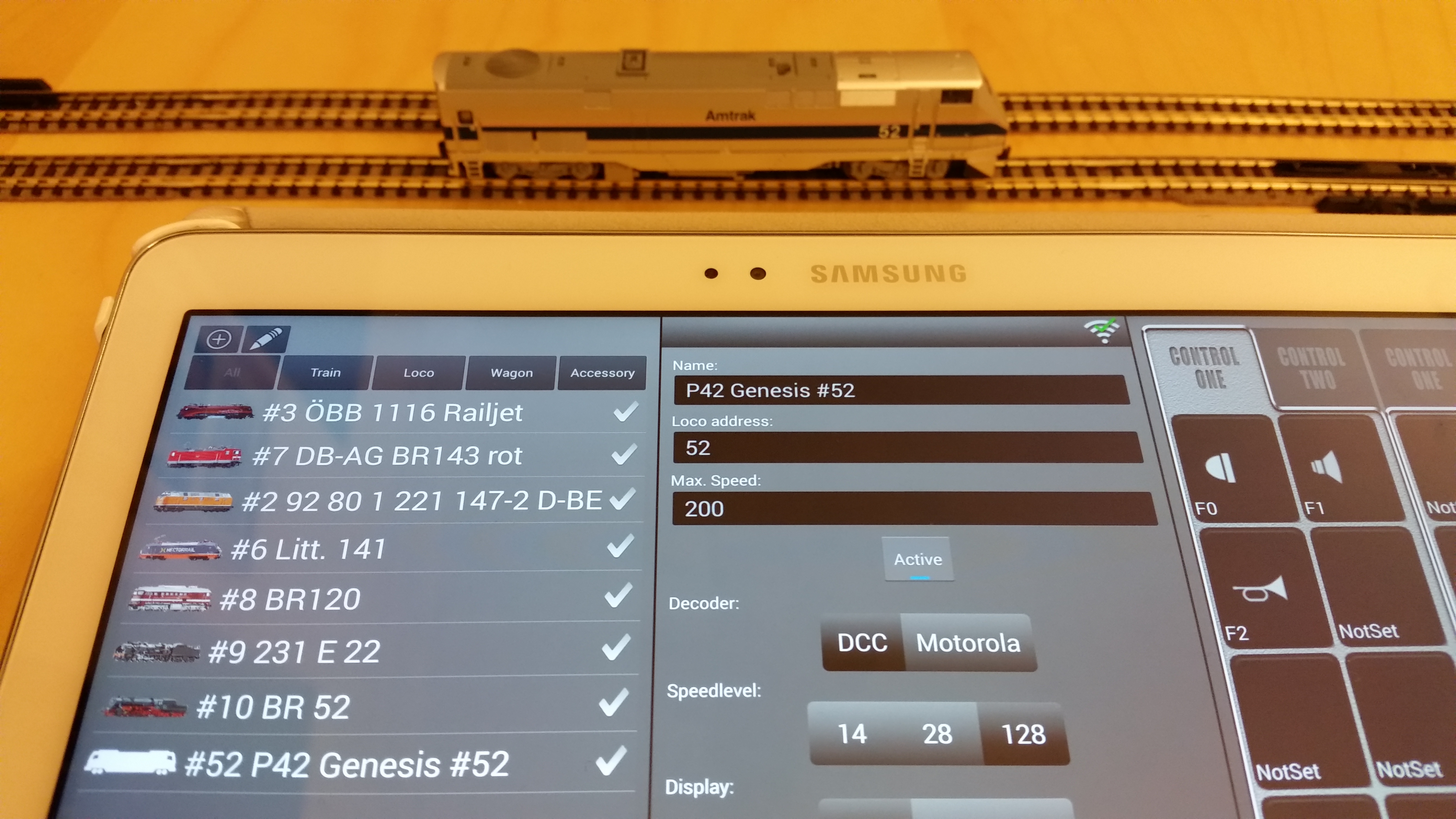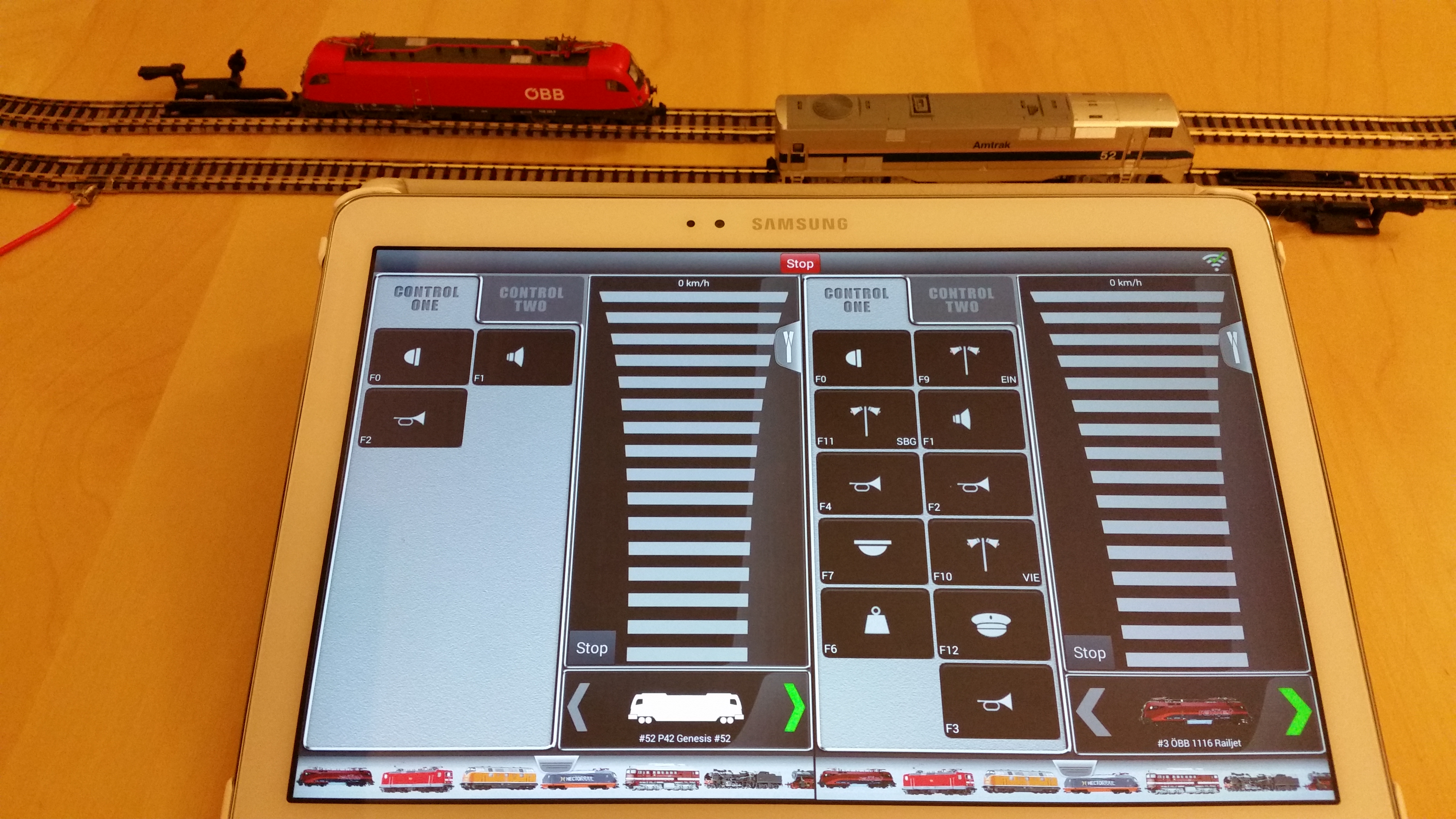 Where is the throttle? Well, you have to provide it yourself. The beauty of the white z21 or black Z21 (www.Z21.eu) is you could use your smart devices such iPhone, iPad, Android phone or tablet as a virtual throttle. Just download the Roco Z21 app and you are (almost) ready to go. On iPad or in my case Samsung Galaxy Note 10.1 2014 Edition (Android tablet), you get to control two DCC-trains at the same time and from the same screen (in landscape format). In the photo below, I have the Rh1116 Taurus from the set and P42 Genesis (I will show how easy it was to add new loco to the list). I was able to run both trains on the same screen (left and right hands).