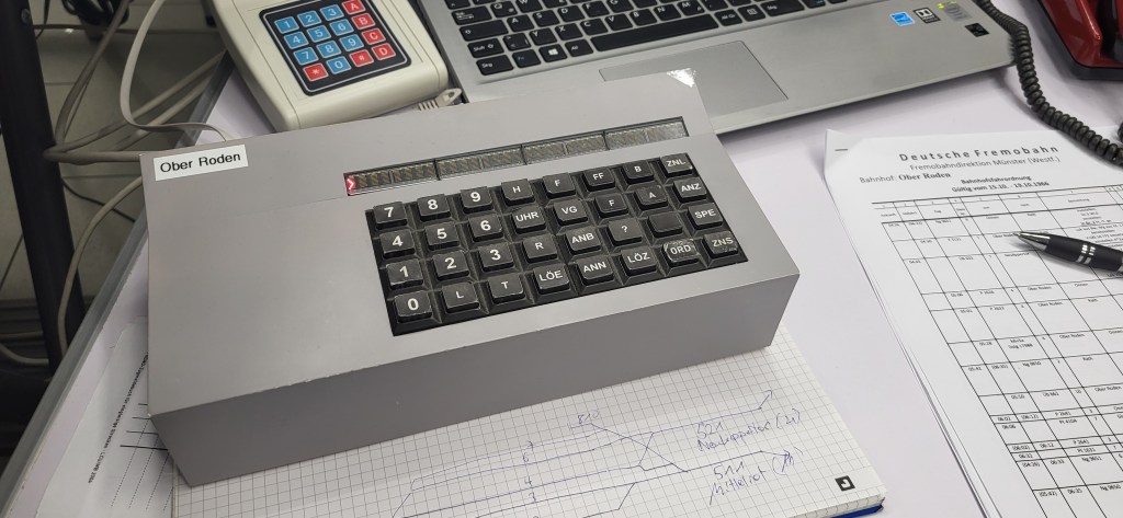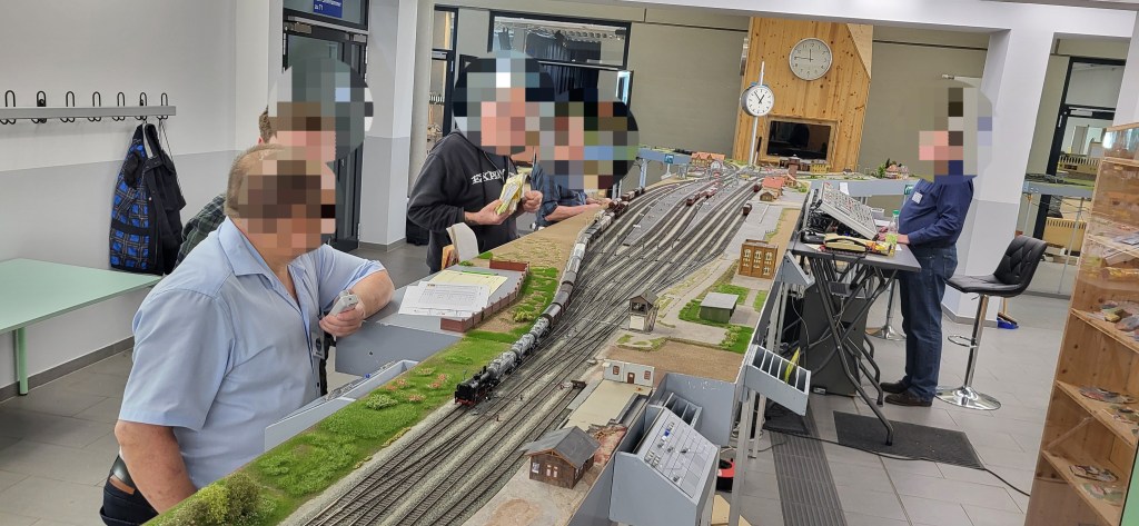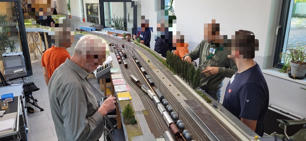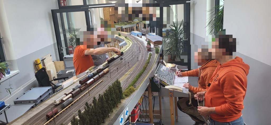 Wir übrigen Teilnehmer waren mit Buchfahrplan und FREMO-Fahrregler ausgestattet und begleiteten unsere Züge entlang der Strecke – stets bemüht, den Fahrplan einzuhalten oder Verspätungen wieder aufzuholen.