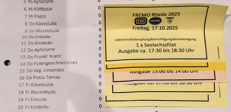 Neben dem hervorragend organisierten Fahrbetrieb wurden auch die Teilnehmer bestens versorgt. Angelika Riegel und Frau Wesse sorgten dafür, dass alle rechtzeitig ihre Mahlzeiten erhielten. Die meisten Teilnehmer hatten ihr Essen im Voraus gebucht und erhielten Essensgutscheine – ein kleines, aber äußerst effizientes System. Das hat mich wirklich beeindruckt!