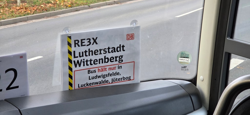 The journey to Luckenwalde took almost seven hours due to rail network modernization works between Lutherstadt Wittenberg and Teltow Stadt. The rail replacement service — a bus route between Lutherstadt and Luckenwalde — wound its way through the ex-Prussian countryside under an early winter sunset.