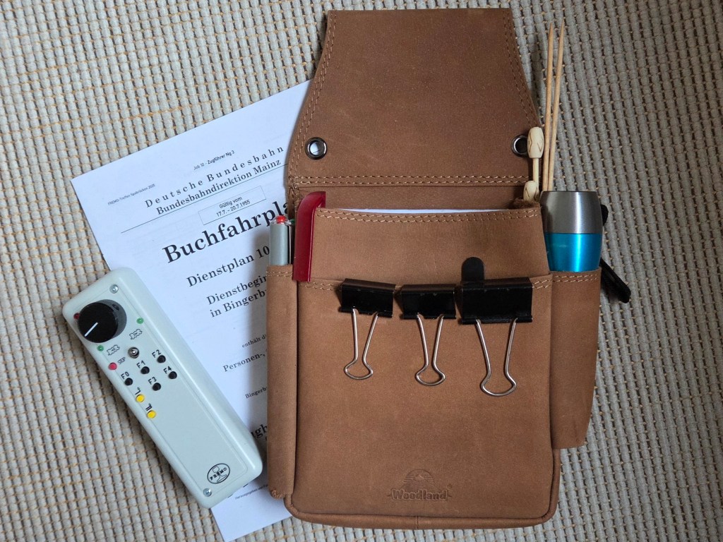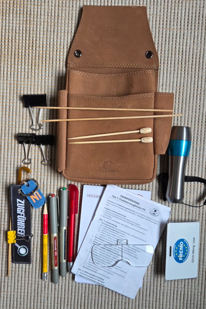 - Stift, Kugelschreiber und Notizblock: Natürlich braucht man etwas zum Schreiben bzw. Notieren, zum Beispiel bei Störungen an Wagen. Ich habe zusätzlich einen roten und einen grünen Kugelschreiber dabei, falls ich auch einmal die Rolle des Zugleiters übernehme.