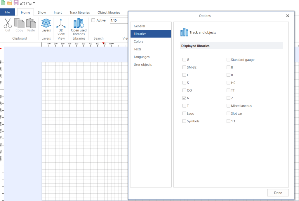 Under the Options menu in File, you can pre-define several settings such as user interface options, displayed libraries (useful if you want to work with more than one scale), color schemes for tracks and grids, and language settings.