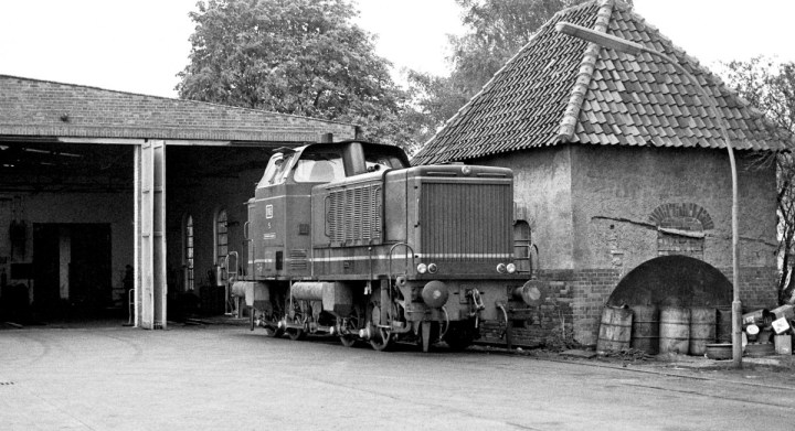Oben: V-Lok DL5 MaK 650D am alten Lokschuppen, mit den Resten eines Wasserturms, ca. 1967.