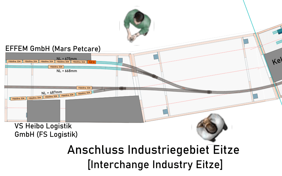 Angesichts der Bedeutung dieser drei Anschließer für die Heimtierfutter-Lieferkette und als Hauptursache für den Übergabe- und Rangierverkehr zwischen VWE und DB in Verden möchte ich sie in das FREMO-Modulkonzept einbeziehen. Aus praktischen Gründen beschränke ich mich derzeit auf den nördlichen Teil des Industriegebiets Eitze.