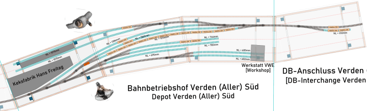 First rendition of the detailed view of the depot area at Verden (Aller) Süd, showing usable track lengths.
