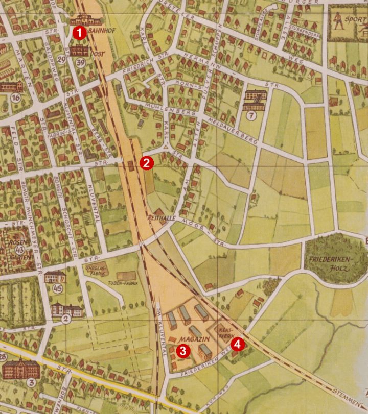 Ausschnitt aus dem Stadtplan von 1965 mit der Lage von DB-Bahnhof Verden (Aller) Süd, Kleinbahnhof Verden–Walsrode, Heeresverpflegungsamt und der Keksfabrik Hans Freitag. Quelle: Ansichtskarten Landkreis Verden.