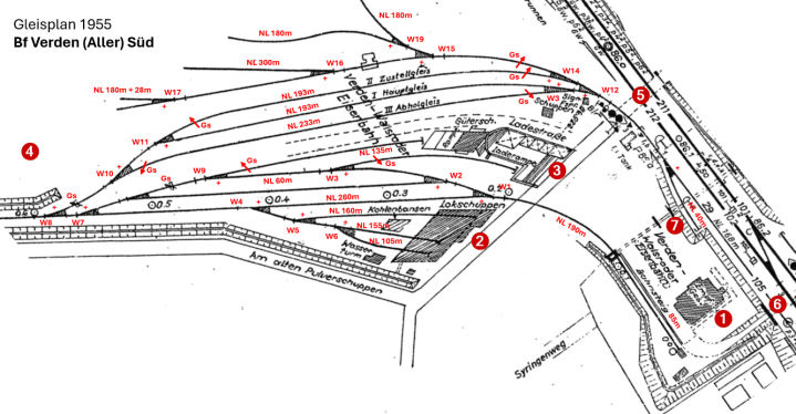 The 1955 track plan of Verden (Aller) Süd forms the baseline for my Epoch IV interpretation. On this plan, I have identified the usable track lengths (Nutzlängen), as well as the positions of derailers and switches. Other identifiable objects include: