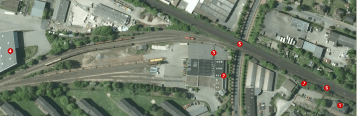 - Effem GmbH (since 1960 in Verden): The initial siding serving Effem was built in 1964 and located at km 2.03 (position 1). As freight volumes increased, the track layout within the compound was expanded in 1972, including a scissor crossing (position 3) and a single crossover at the northern end. During the redevelopment in 1998, the original siding and much of the internal trackage were removed. The entry to the Effem site was shifted to the northern side (position 2, km 1.4), and two loading tracks were shortened, likely to accommodate factory expansion.
