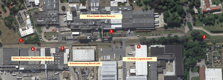 - Günther Badenhop Fleischwerke GmbH (since 1969 in Verden): The original single-entry siding was built in 1972 (position 4, km 2.06). After the scrap recycling firm Bernd Löbl relocated from Verden (Aller) Süd in 1980, the Badenhop siding was extended in 1990 (position 5), further increasing its operational importance.